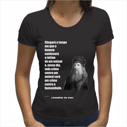 A camiseta estampa o pensamento: “Chegará o tempo em que o homem conhecerá o íntimo de um animal e, nesse dia, todo crime contra um animal será um crime contra a humanidade”. Este pensamento é do gênio Leonardo Da Vinci que estava além de sua época e traduz todo questionamento contemporâneo acerca da equidade aos animais.