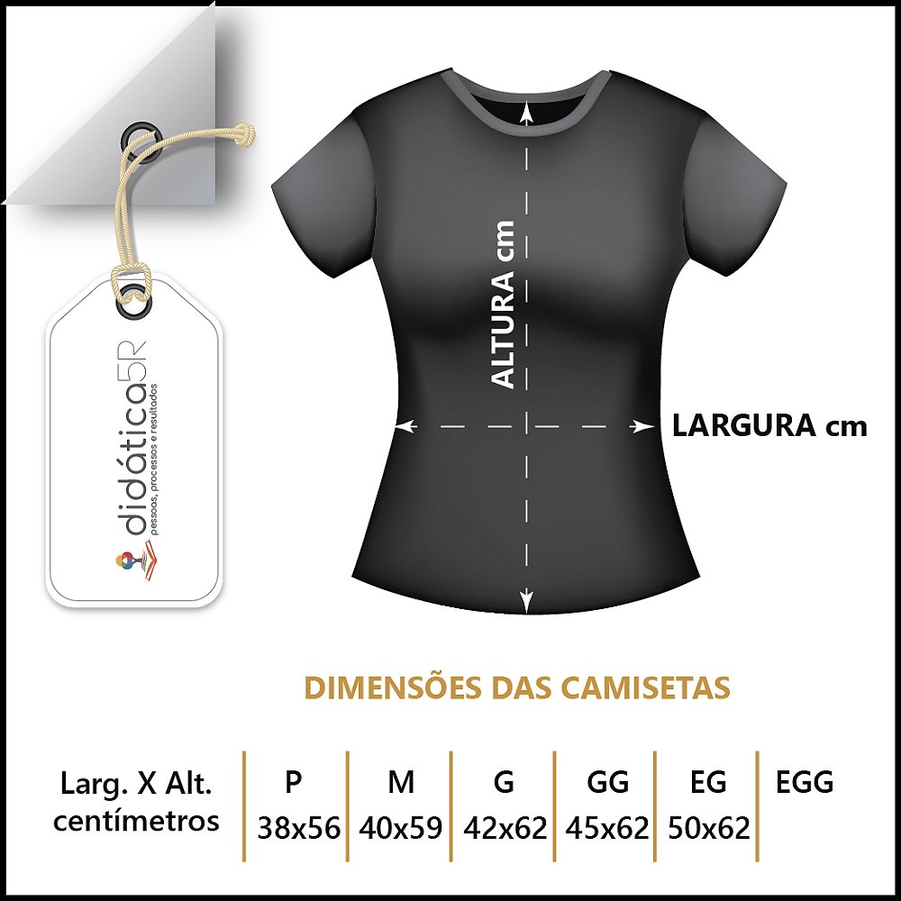 Para se certificar de que está adquirindo o tamanho correto de seu produto, sugerimos que meça uma camiseta que costuma utilizar e se sinta confortável; depois é só comparar as medidas obtidas com as da tabela da imagem abaixo: